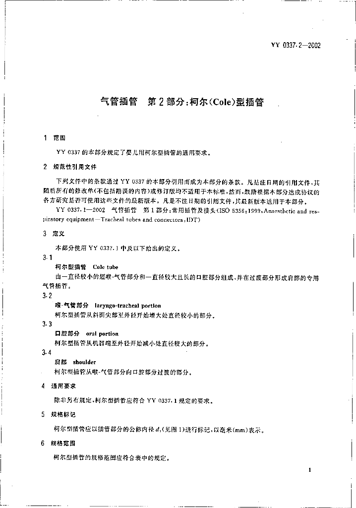YY 0337.2-2002 气管插管 第2部分:柯尔(Cole)型插管