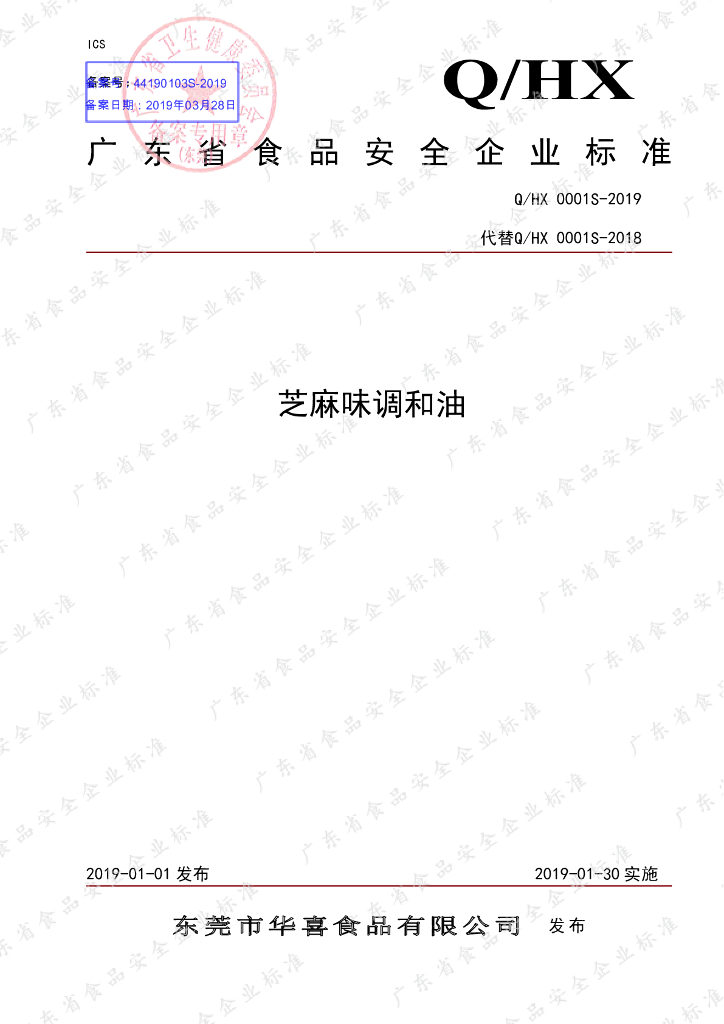 Q/HX 0001S-2019 芝麻味调和油