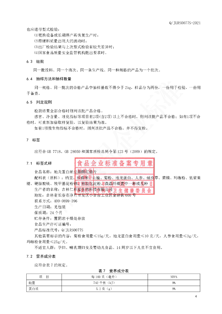 Q/JLRS 0077S-2021 地龙蛋白纳豆激酶红曲片