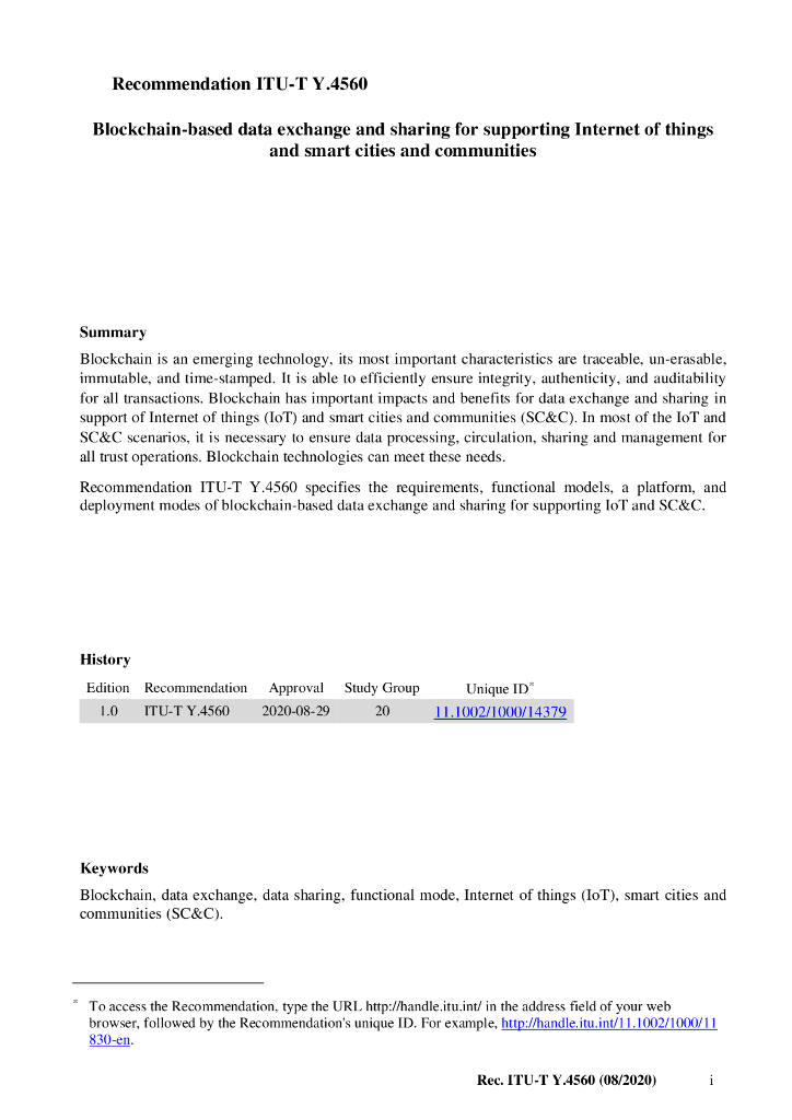ITU-T Y.4560-2020 基于区块链的数据交换和共享 支持物联网和智慧城市和社区(英文版)