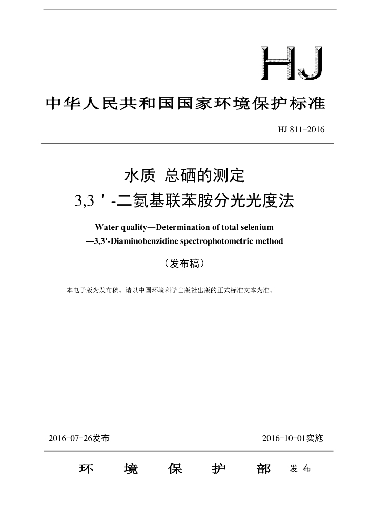 HJ 811-2016 水质 总硒的测定 3,3'-二氨基联苯胺分光光度法