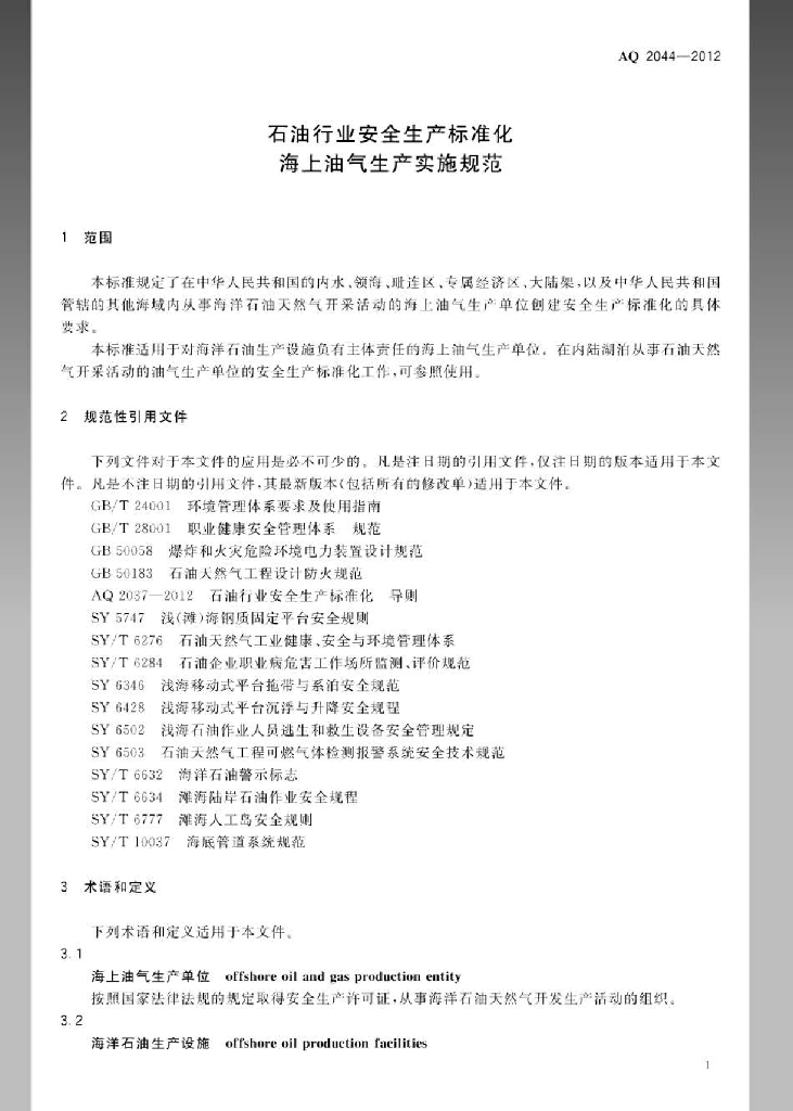 AQ 2044-2012 石油行业安全生产标准化海上油气生产实施规范