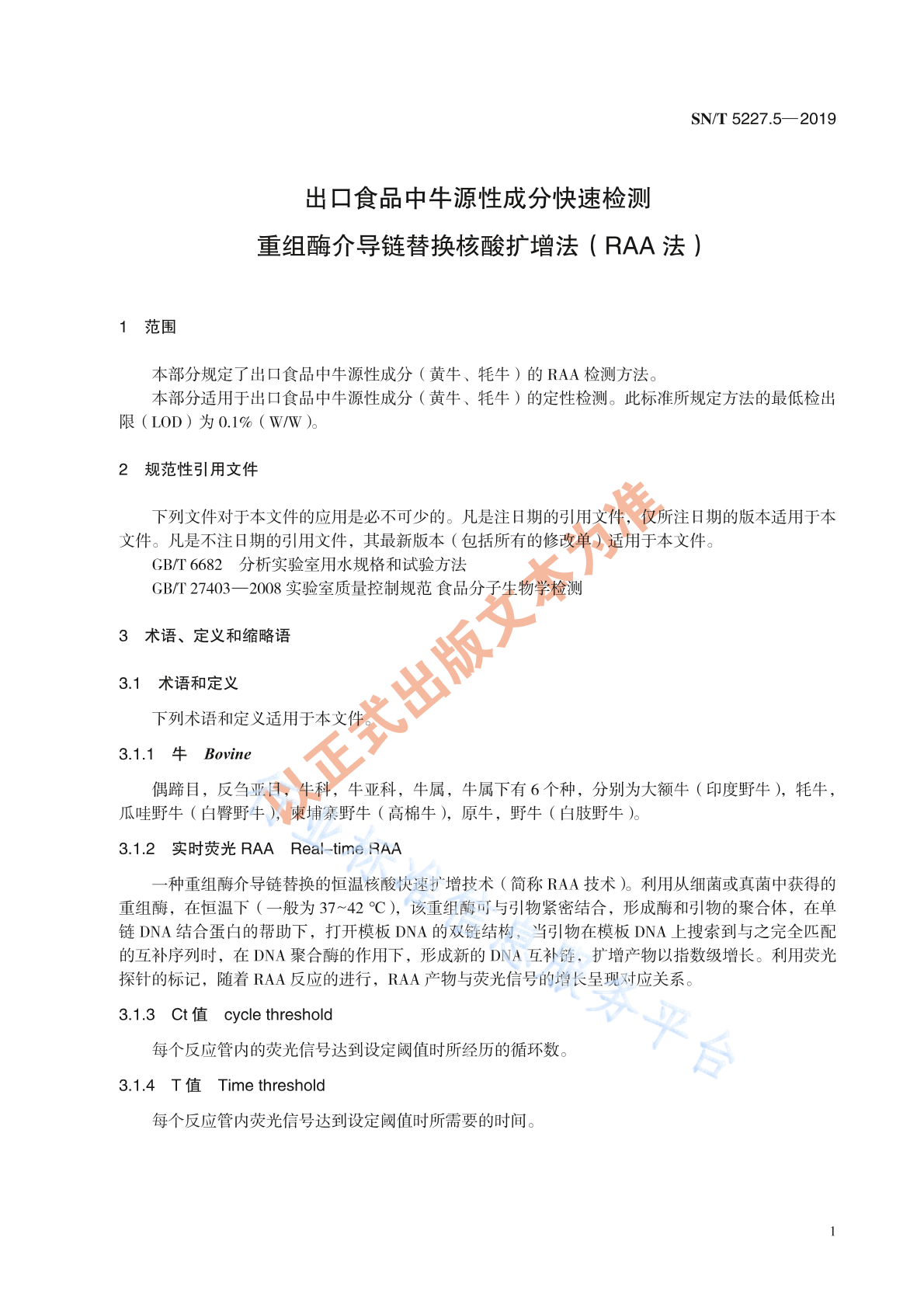 SN/T 5227.5-2019 出口食品中牛源性成分快速检测 重组酶介导链替换核酸扩增法(RAA法)