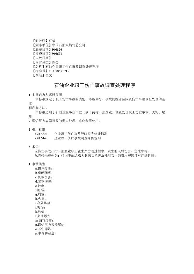 SY 5855-1993 石油企业职工伤亡事故调查处理程序