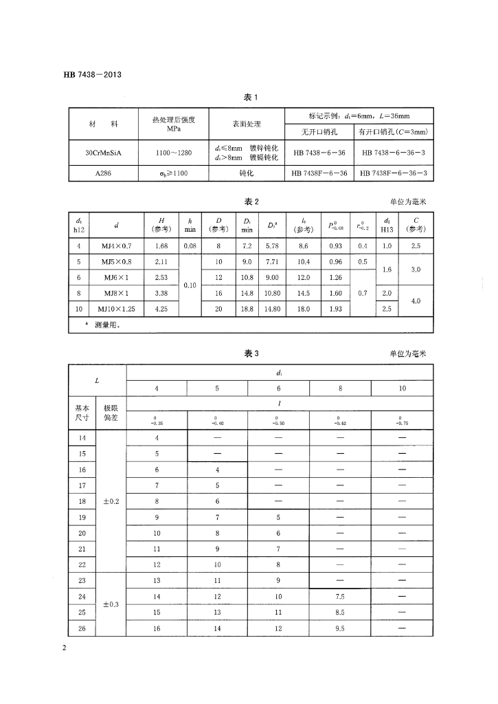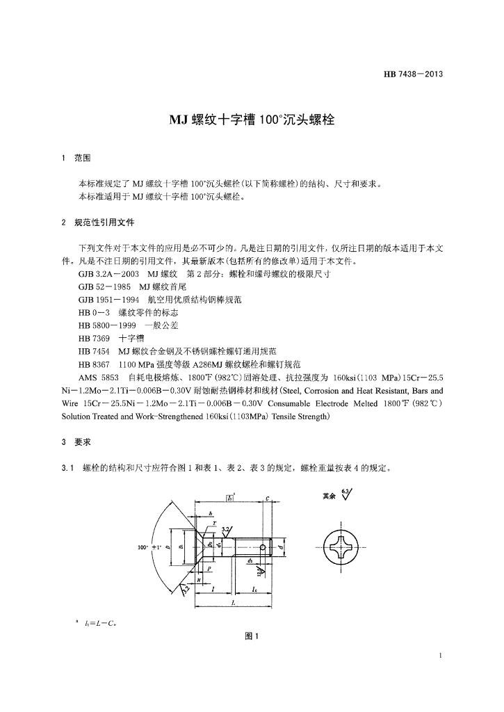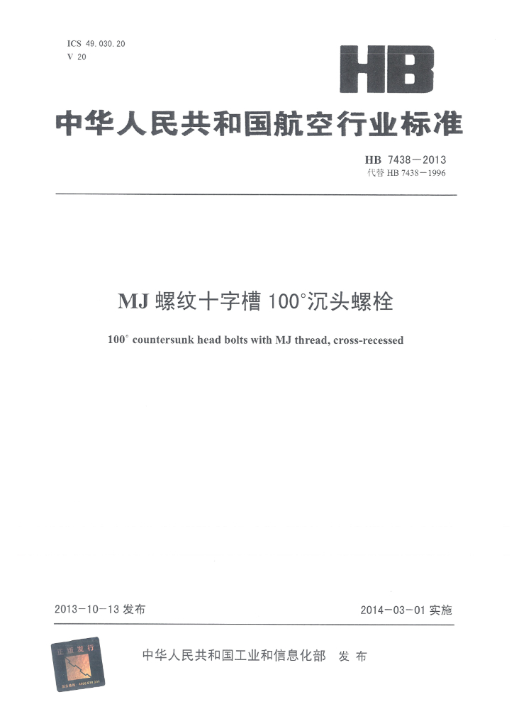 HB 7438-2013 MJ螺纹十字槽100°沉头螺栓