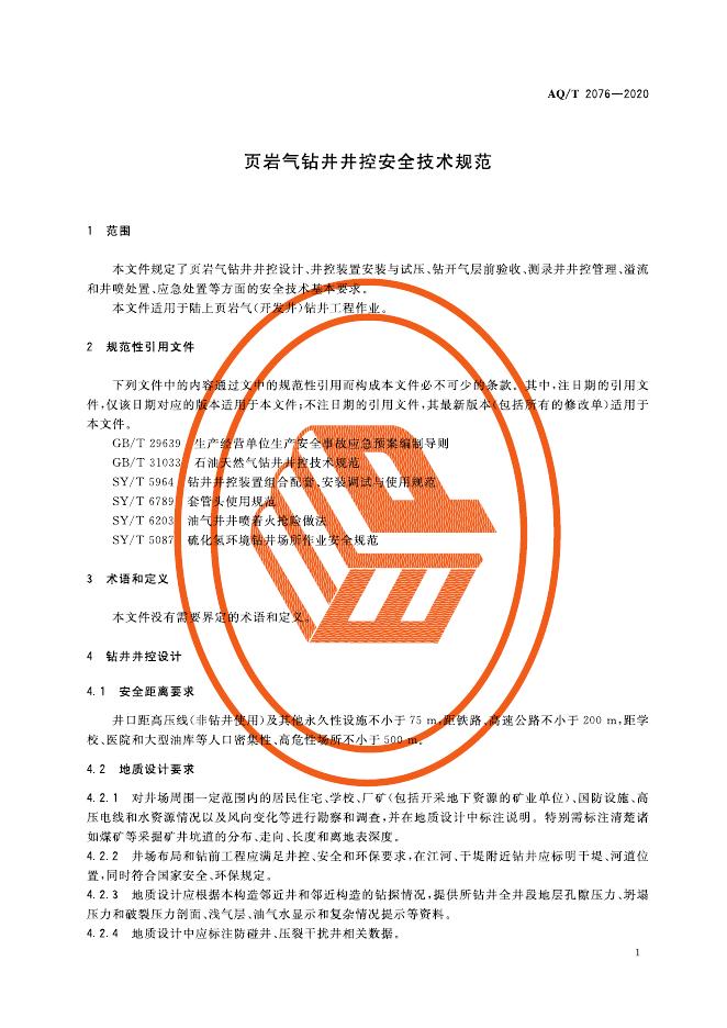 AQ/T 2076-2020 页岩气钻井井控安全技术规范