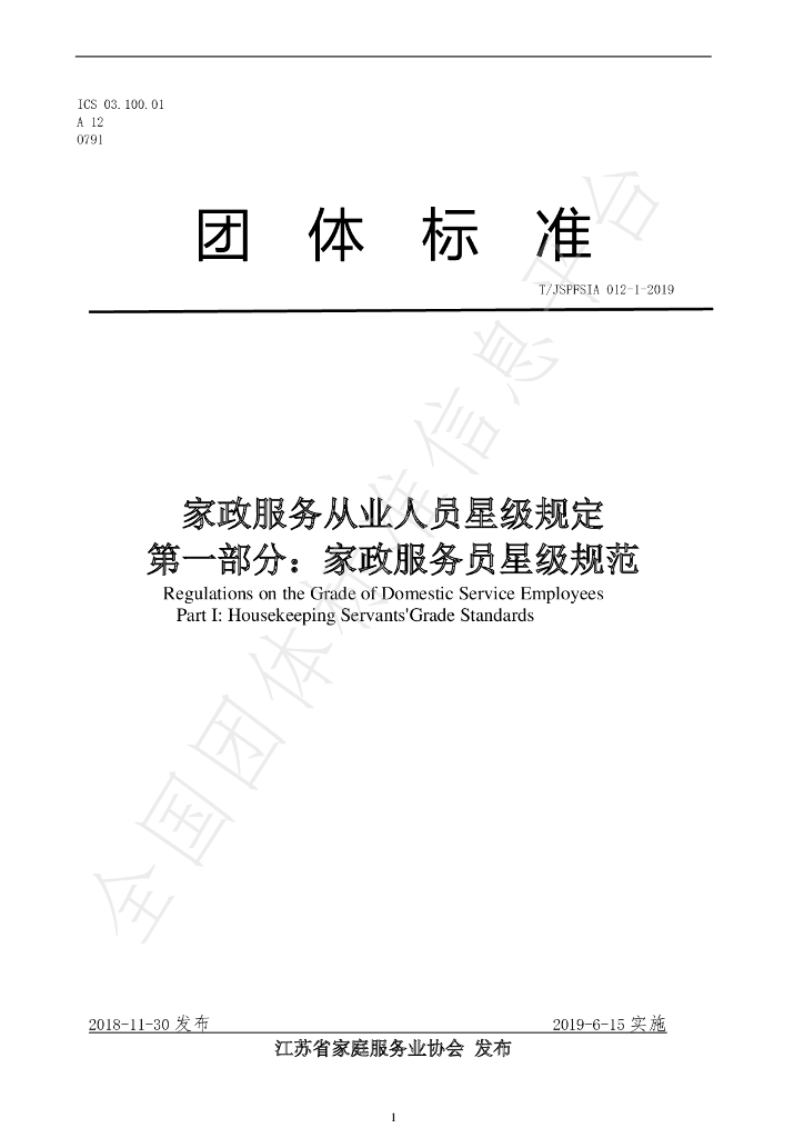 T/JSPFSIA 12-1-2019 家政服务从业人员星级规定 第一部分:家政服务员星级规范