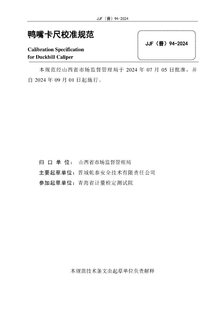JJF(晋)94-2024 鸭嘴卡尺校准规范
