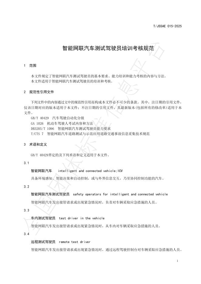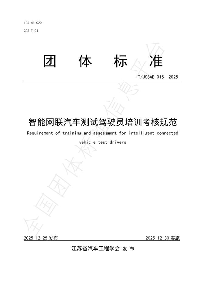 T/JSSAE 015-2025 智能网联汽车测试驾驶员培训考核规范