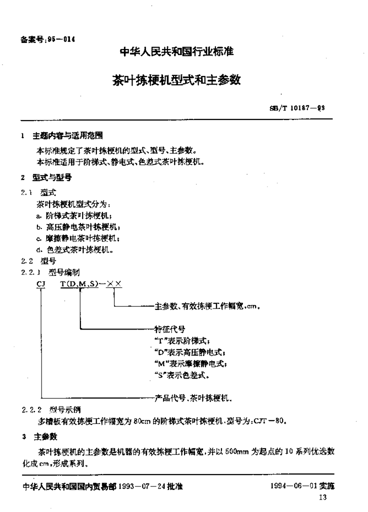 SB/T 10187-1993 茶叶拣梗机型式和主参数