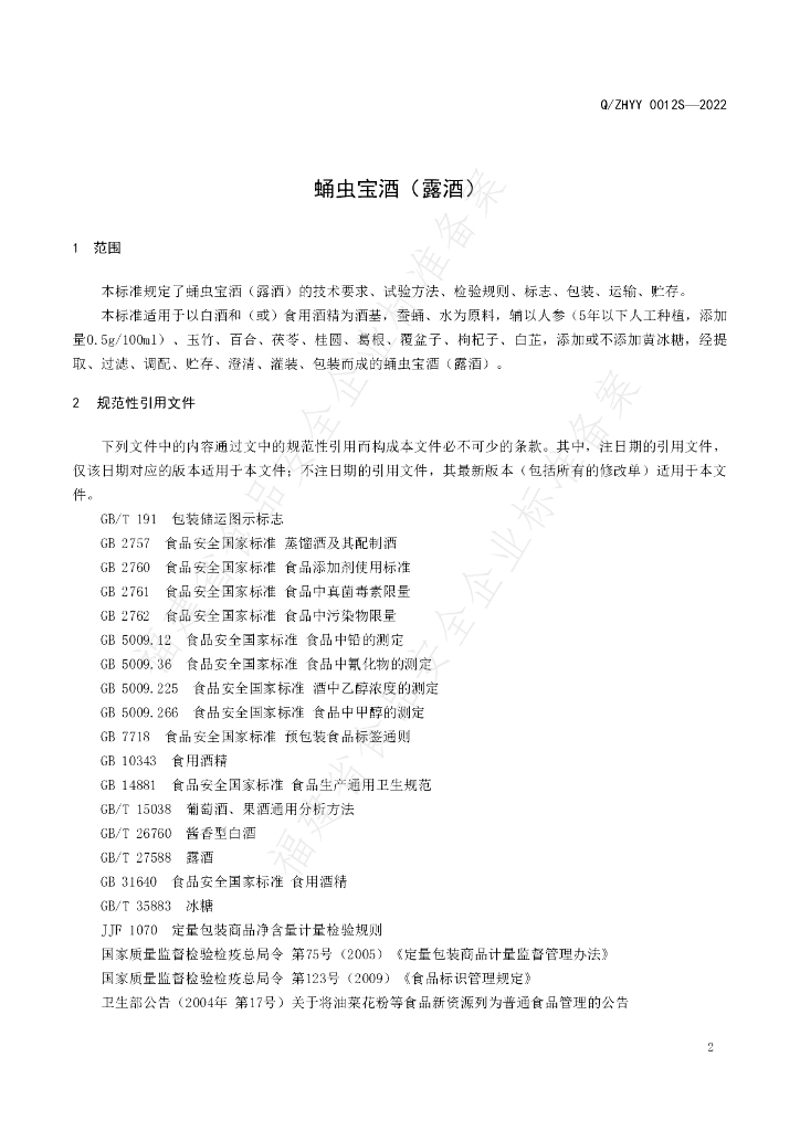 Q/ZHYY 0012S-2022 蛹虫宝酒(露酒)