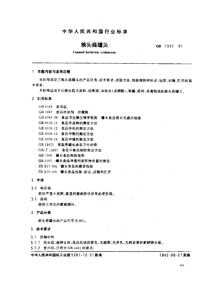 QB 1397-1991 猴头菇罐头