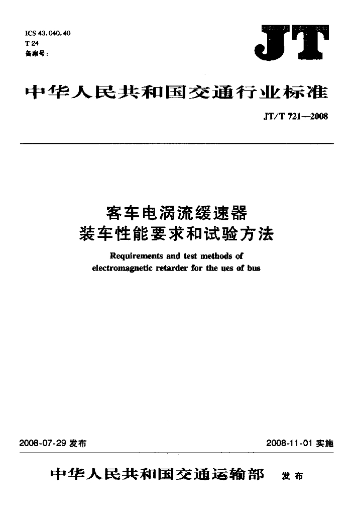 JT/T 721-2008 客车电涡流缓速器装车性能要求和试验方法