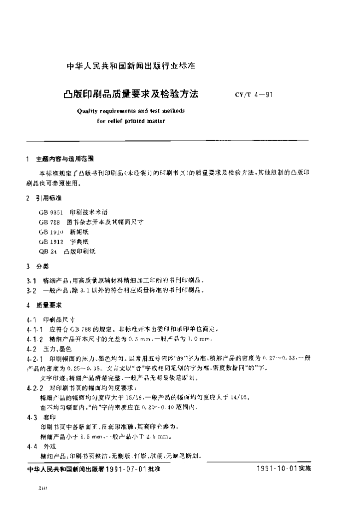 CY/T 4-1991 凸版印刷品质量要求及检验方法