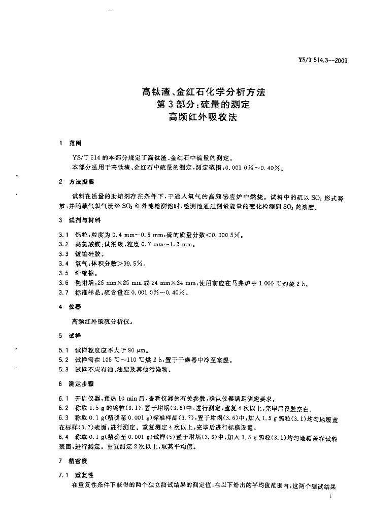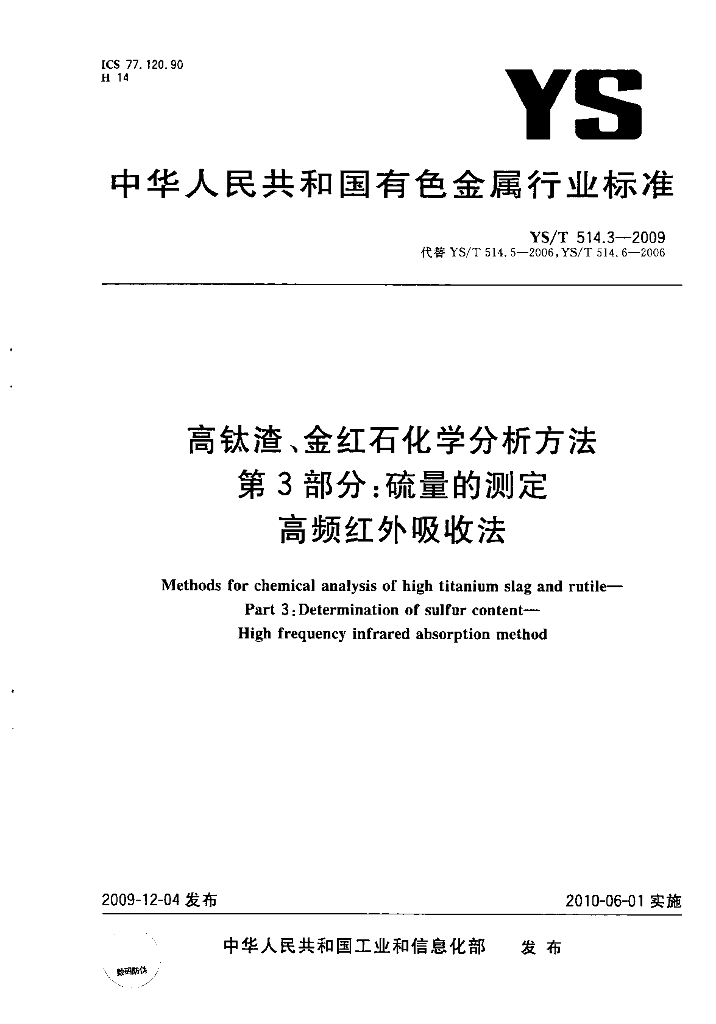 YS/T 514.3-2009 高钛渣、金红石化学分析方法 第3部分:硫量的测定 高频红外吸收法