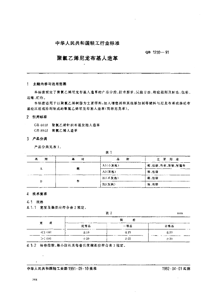 QB/T 1230-1991 聚氯乙烯尼龙布基人造革