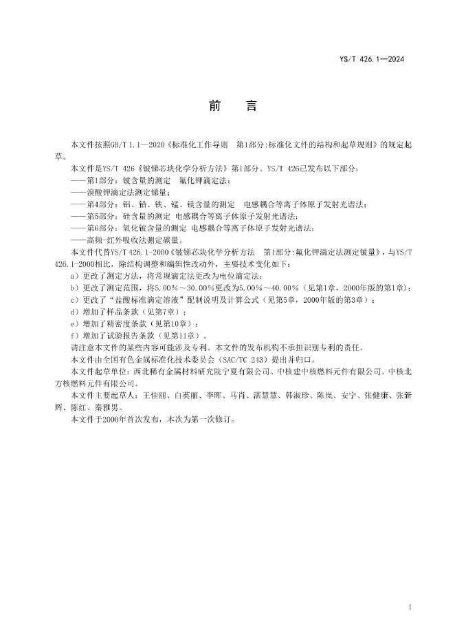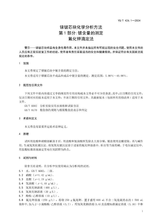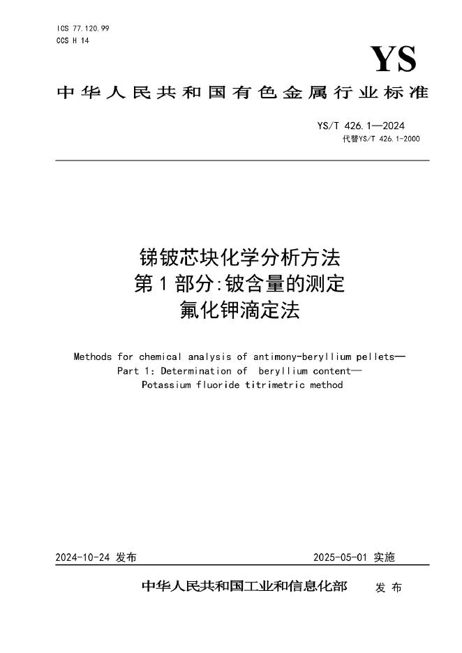 YS/T 426.1-2024 锑铍芯块化学分析方法 第1部分:铍含量的测定 氟化钾滴定法