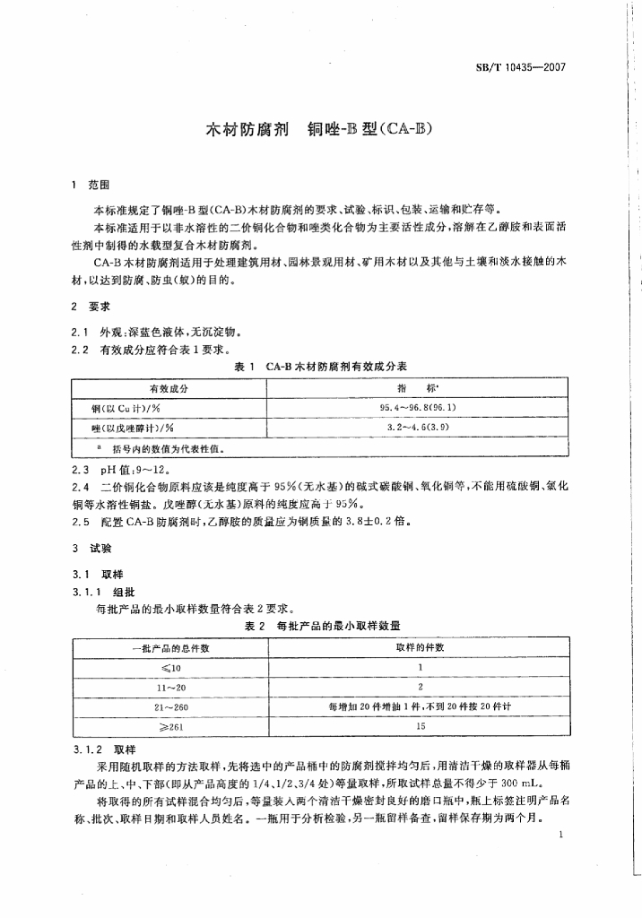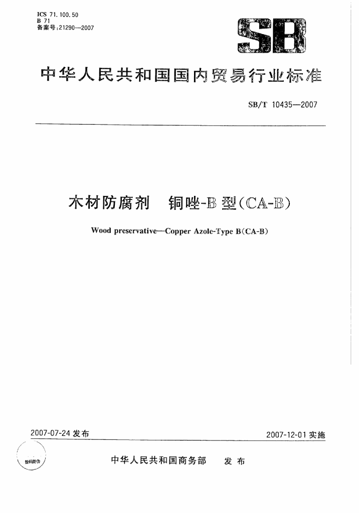 SB/T 10435-2007 木材防腐剂-铜唑-B型(CA-B)