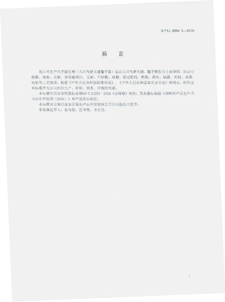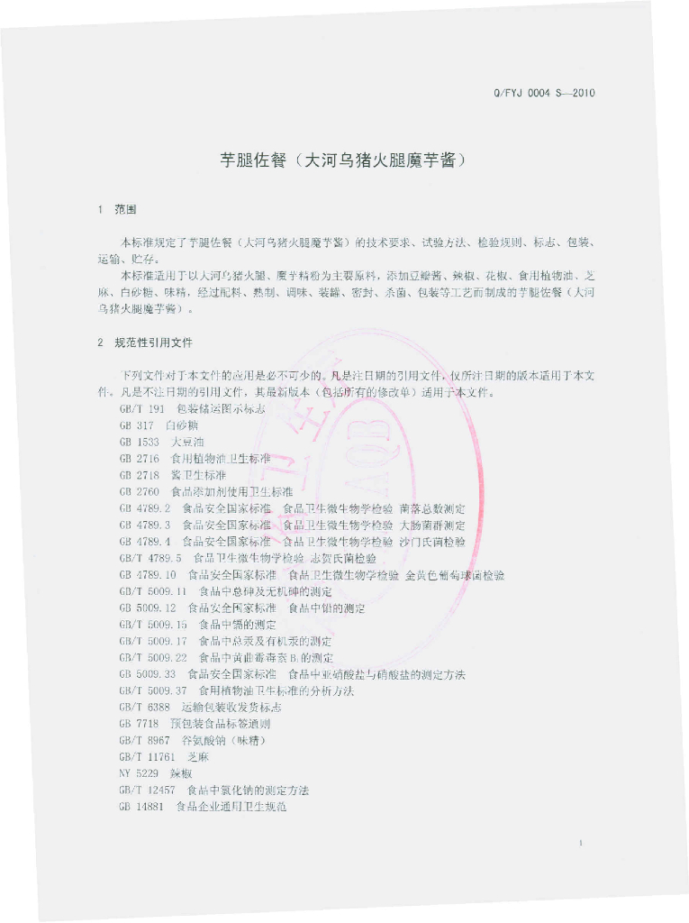 Q/FYJ 0004S-2010 芋腿佐餐(大河乌猪火腿魔芋酱)