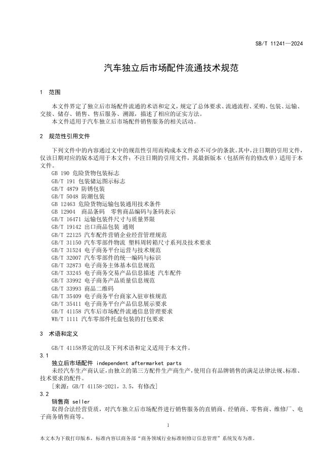 SB/T 11241-2024 汽车独立后市场配件流通技术规范