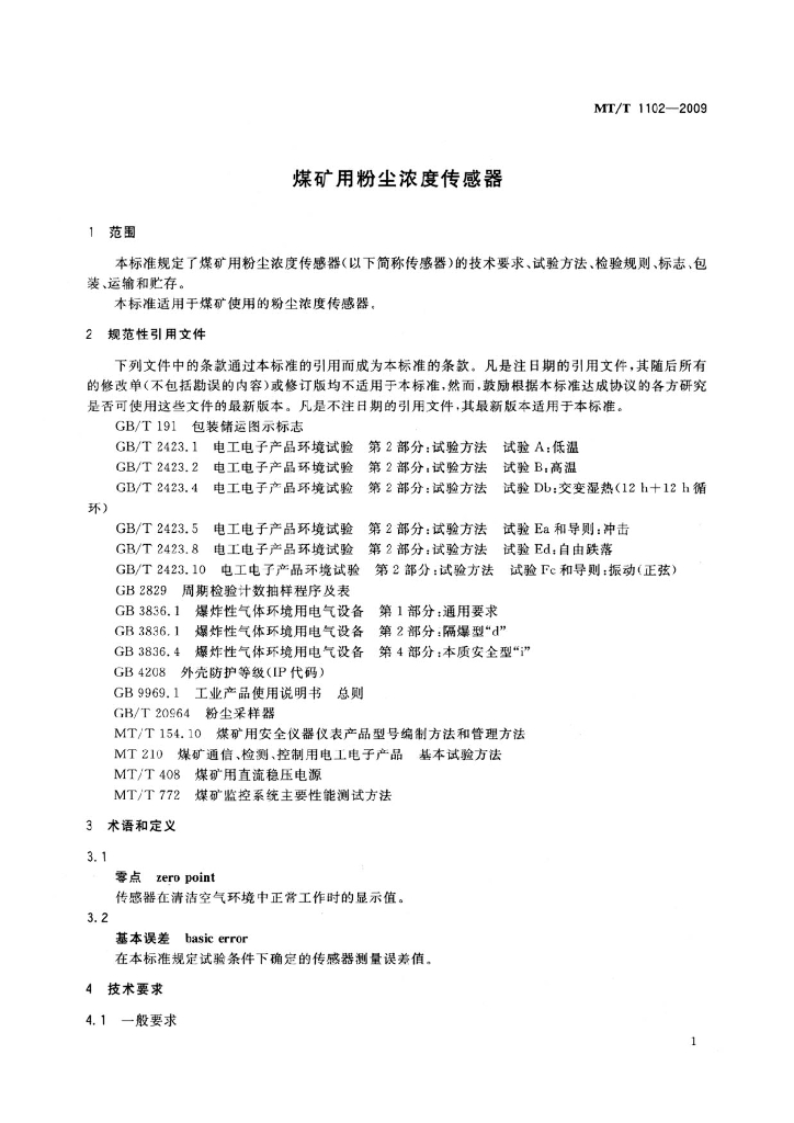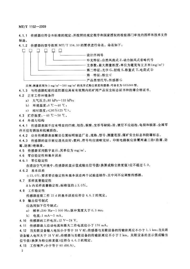MT/T 1102-2009 煤矿用粉尘浓度传感器