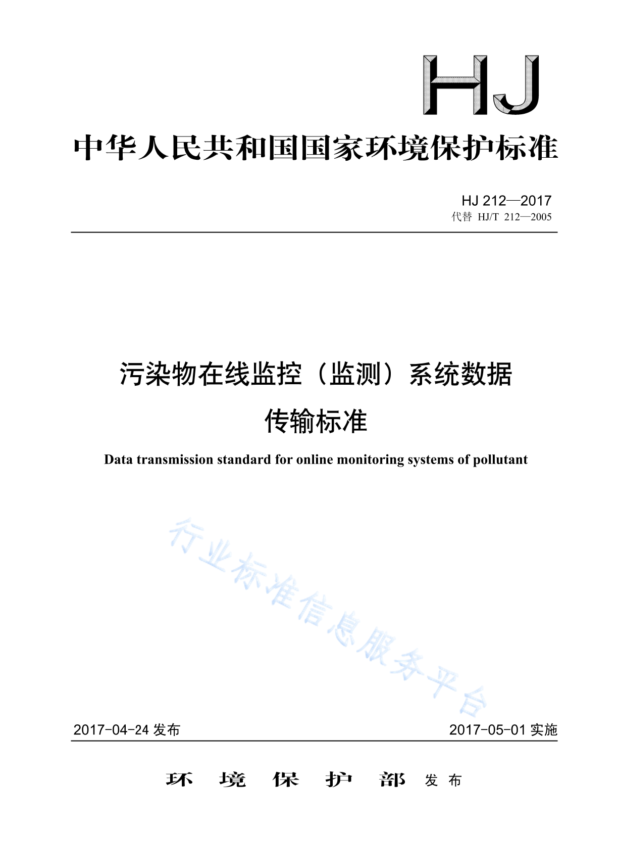 HJ 212-2017 污染物在线监控(监测)系统数据传输标准
