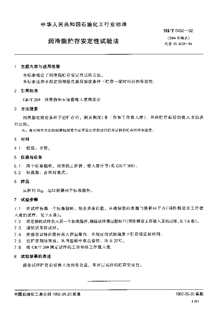 SH/T 0452-1992 润滑脂贮存安定性试验法