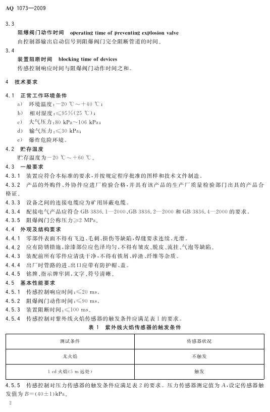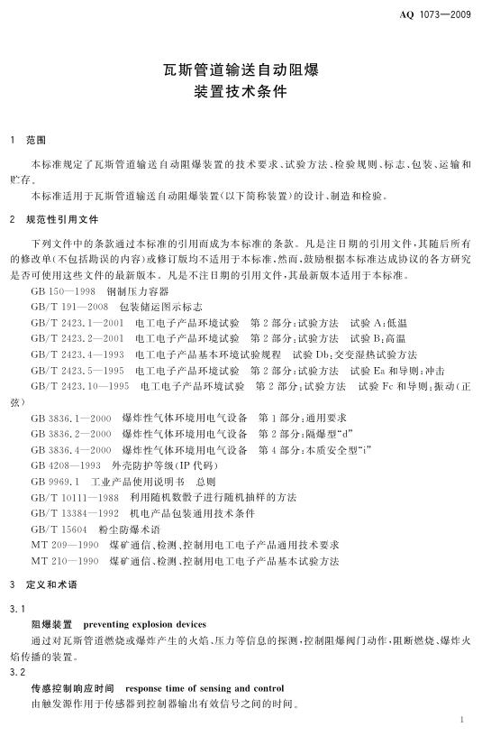 AQ/T 1073-2009 瓦斯管道输送自动阻爆装置技术条件