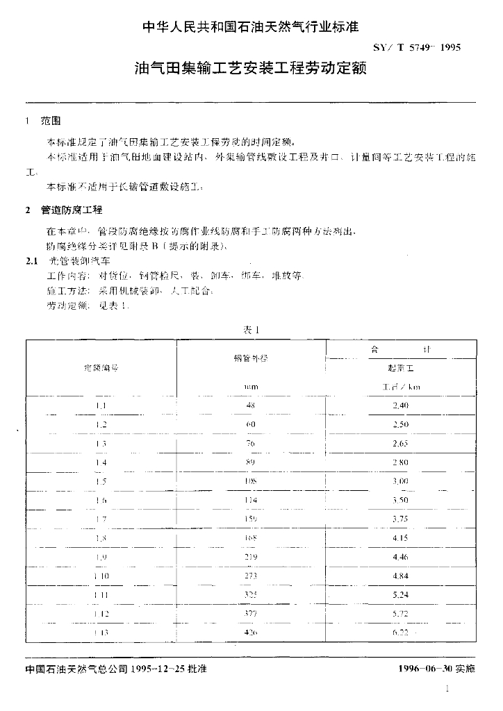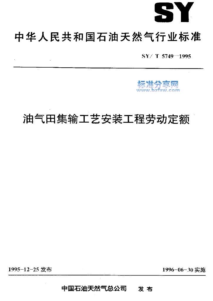 SY/T 5749-1995 油气田集输工艺安装工程劳动定额