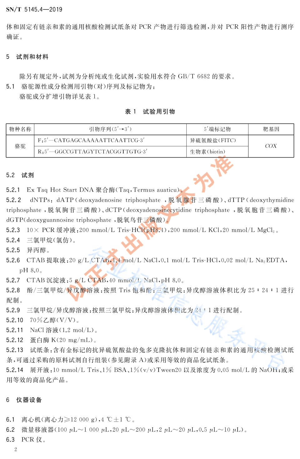 SN/T 5145.4-2019 出口食品及饲料中动物源成分快速检测方法 第4部分:骆驼成分检测 PCR-试纸条法