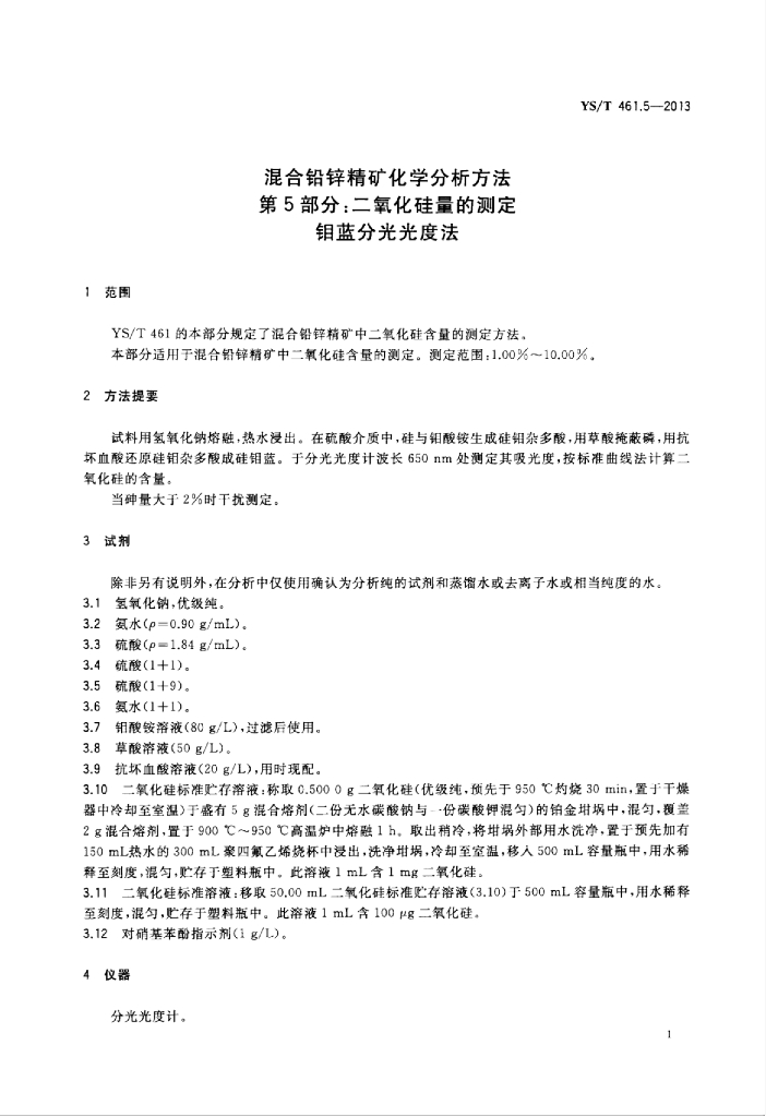 YS/T 461.5-2013 混合铅锌精矿化学分析方法 第5部分:二氧化硅量的测定钼蓝分光光度法