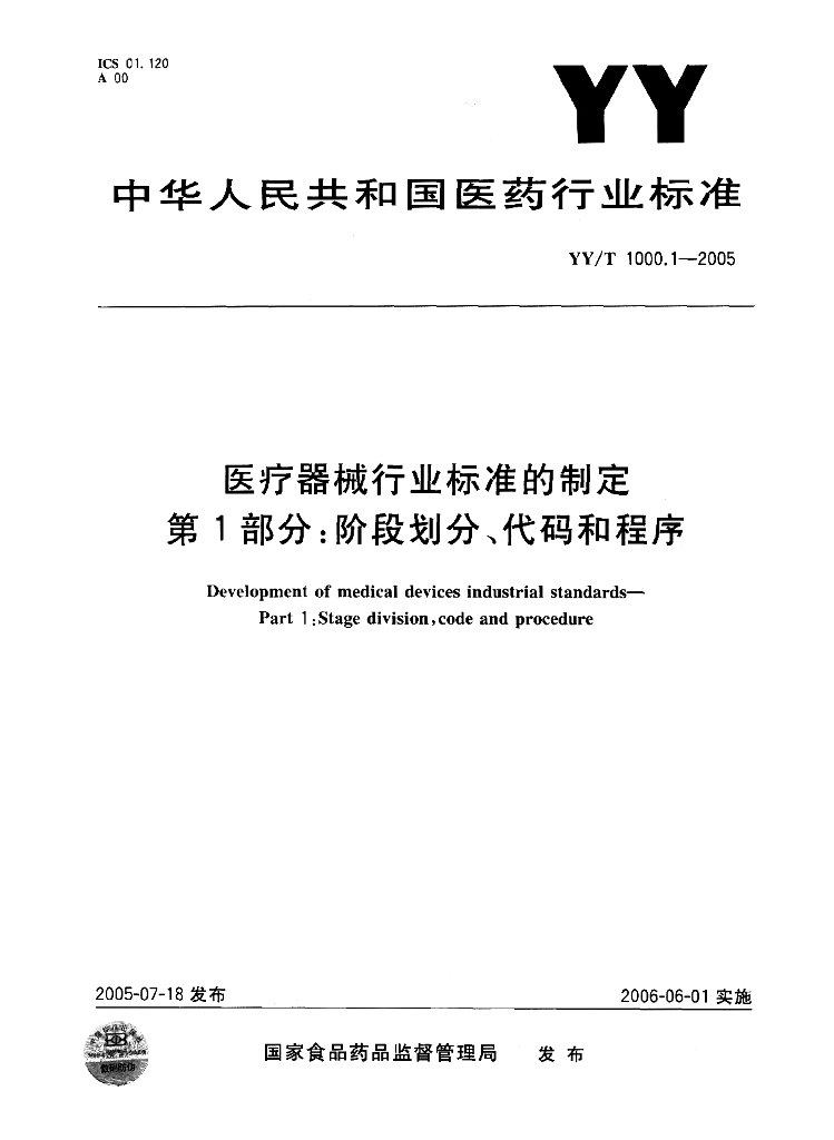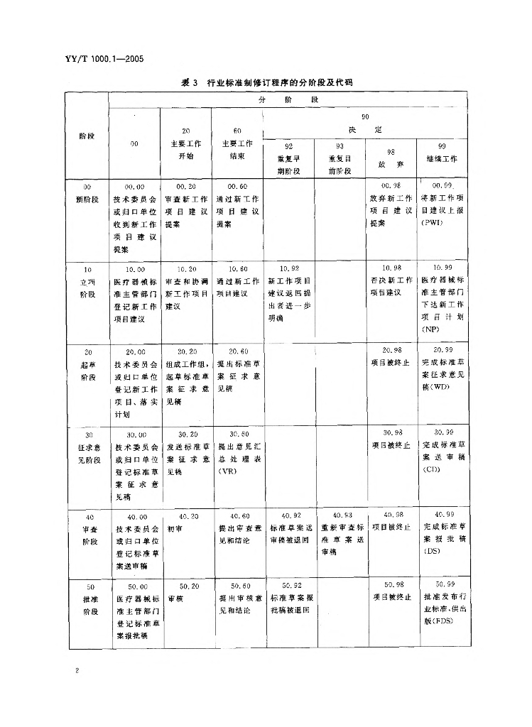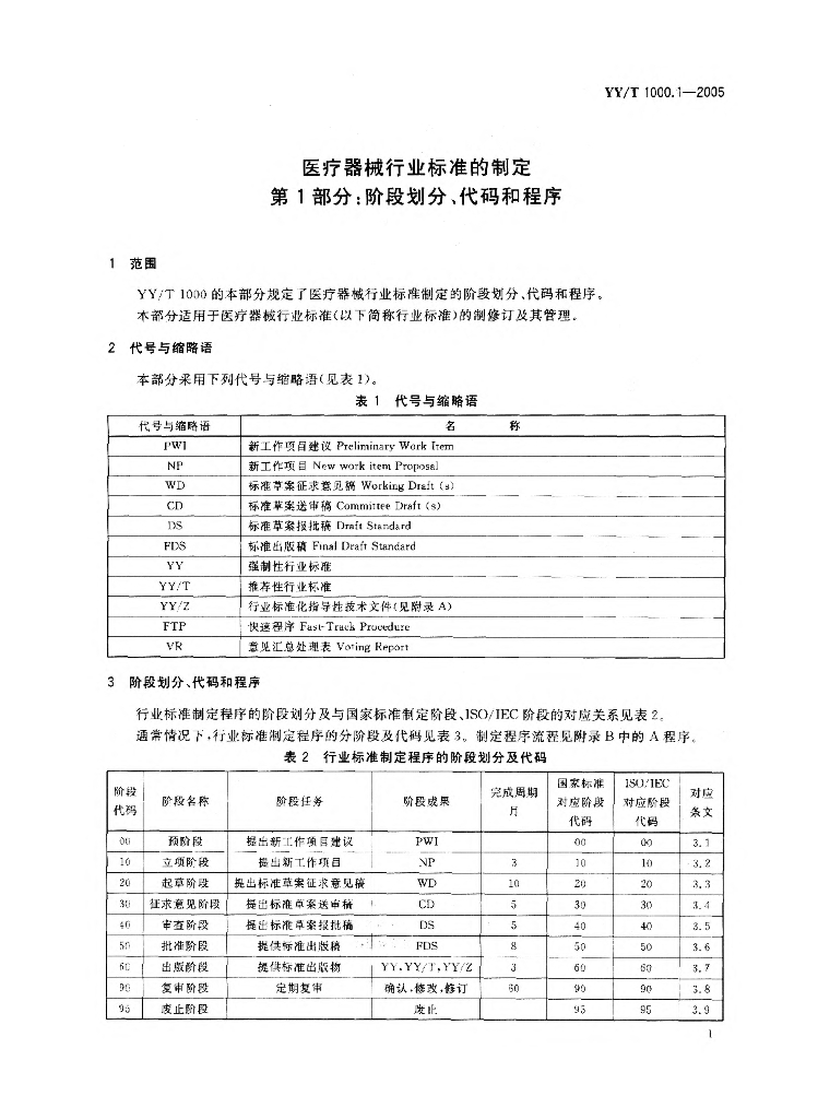 YY/T 1000.1-2005 医疗器械行业标准的制定 第1部分:阶段划分、代码和程序