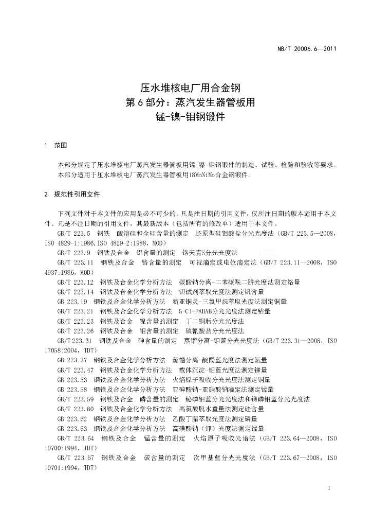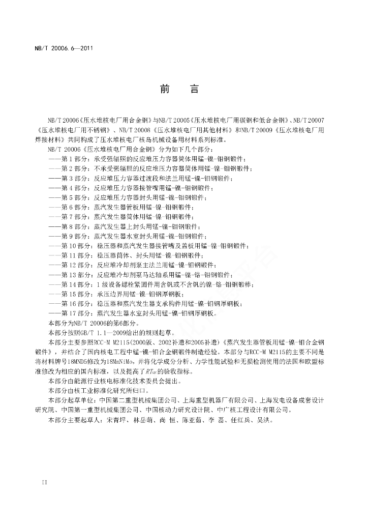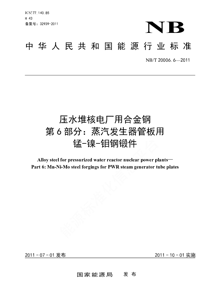 NB/T 20006.6-2011 压水堆核电厂用合金钢 第6部分:蒸汽发生器管板用锰-镍-钼钢锻件