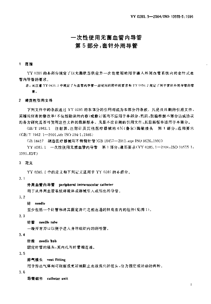 YY 0285.5-2004/ISO 10555-5:1996 一次性使用无菌血管内导管 第5部分:套针外周导管