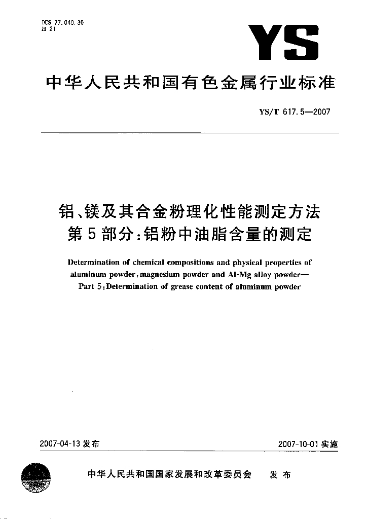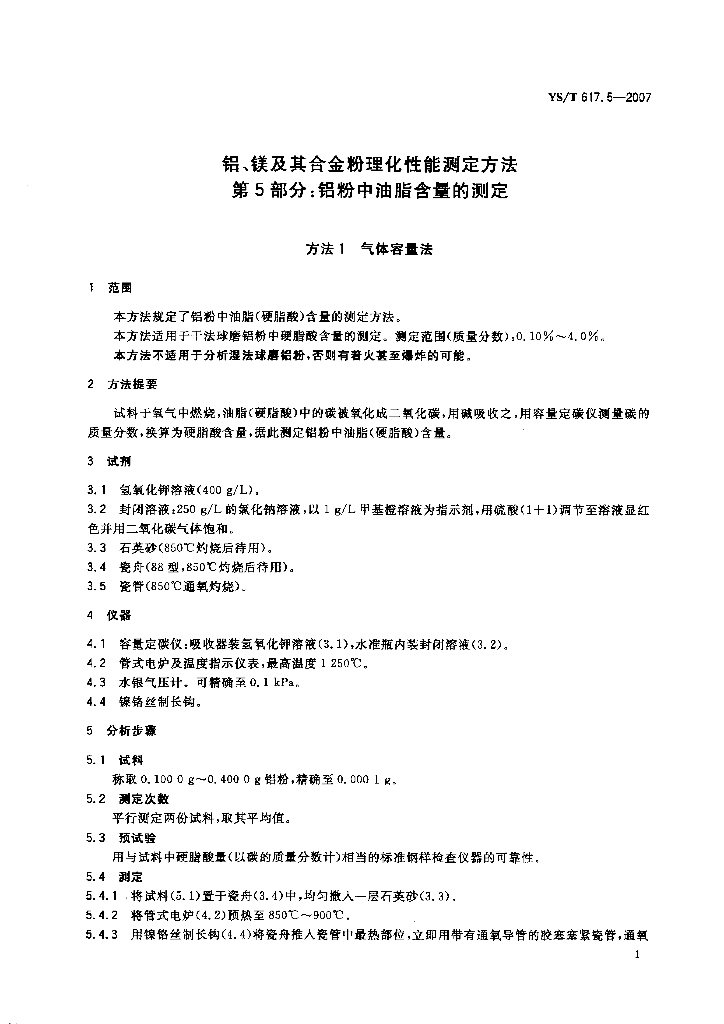 YS/T 617.5-2007 铝、镁及其合金粉理化性能测定方法 第5部分:铝粉中油脂含量的测定