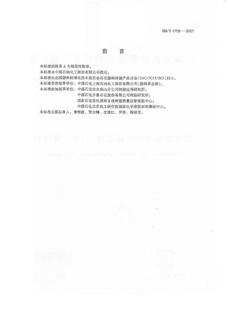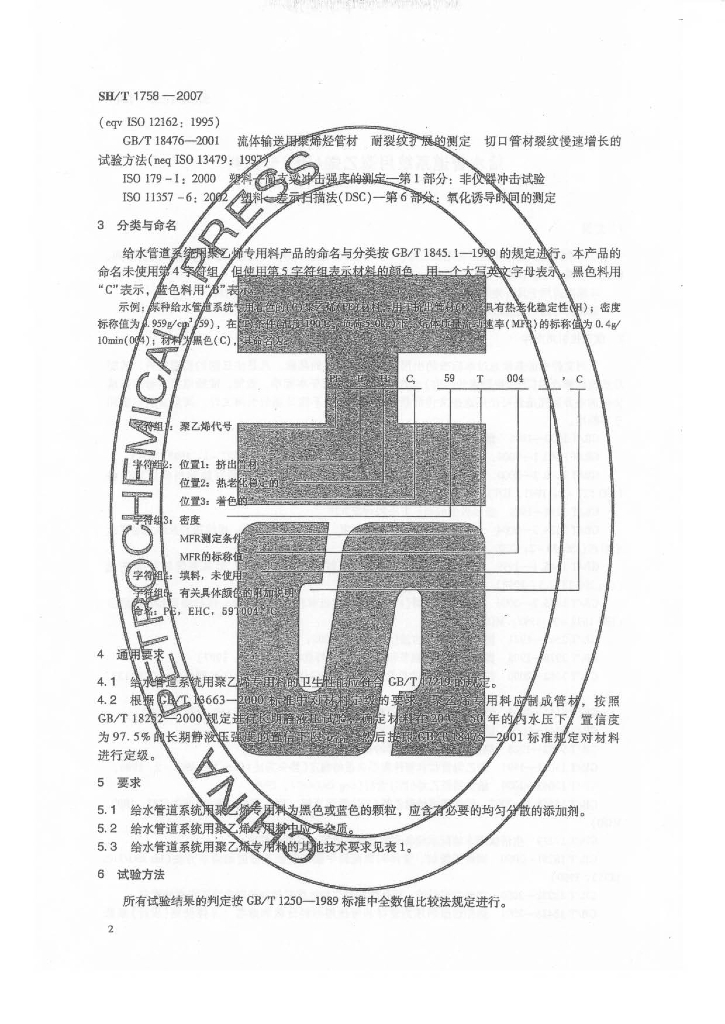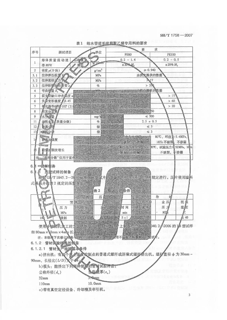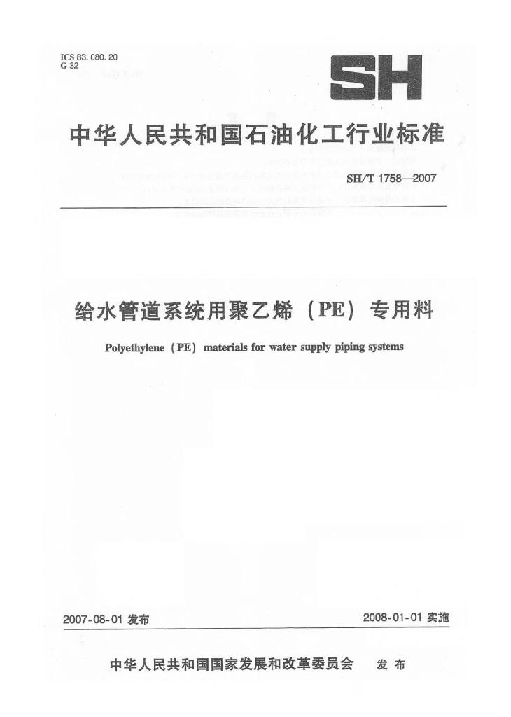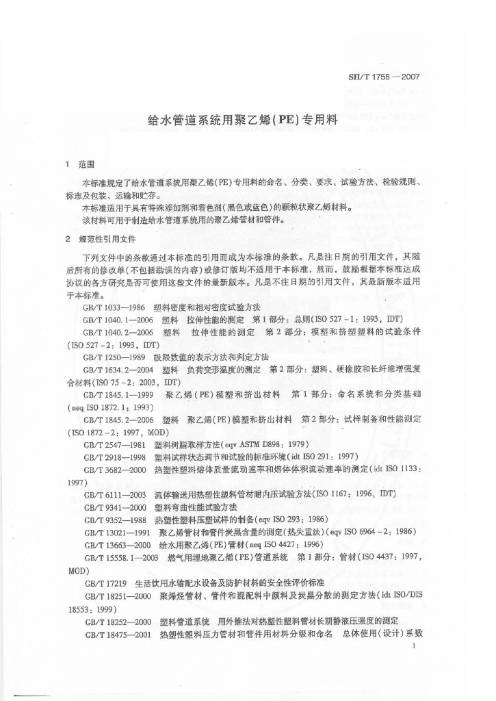SH/T 1758-2007 给水管道系统用聚乙烯(PE)专用料