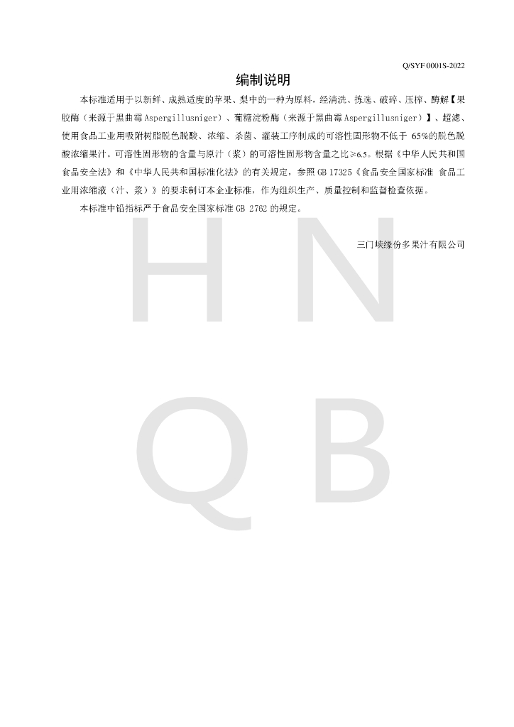Q/SYF 0001S-2022 脱色酸浓缩果汁