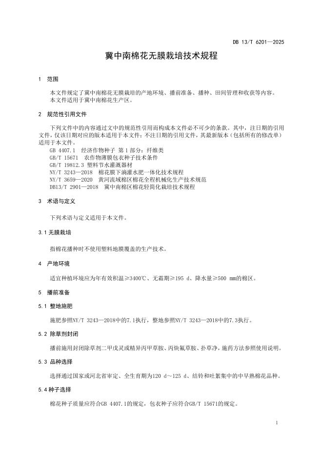 DB13/T 6201-2025 冀中南棉花无膜栽培技术规程