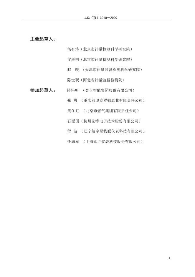 杨有涛(北京市计量检测科学研究院)、文康明(北京市计量检测科学研究院)、赵轶(天津市计量监督检测科学研究院)、陈世砚(河北省计量监督检测院)、钭伟明(金卡智能集团股份有限公司)、张勇(重庆前卫克罗姆表业有限责任公司)、黄冬虹(北京市燃气集团有限责任公司)、石爱国(杭州先锋电子技术股份有限公司)、程波(辽宁航宇星物联仪表科技有限公司)、任海军(上海真兰仪表科技股份有限公司)