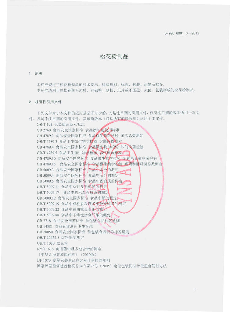 Q/YGC 0001S-2012 松花粉制品