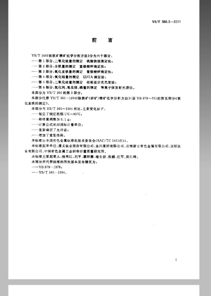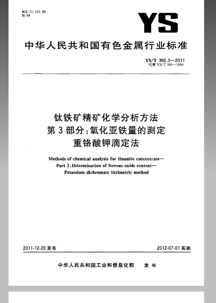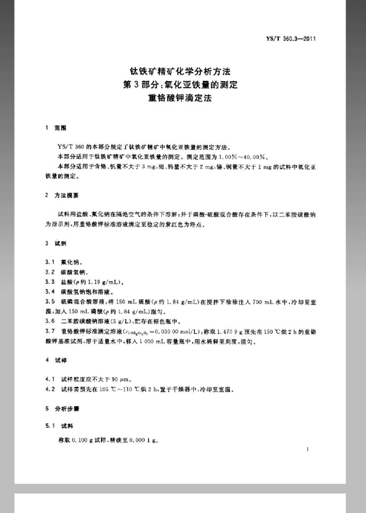 YS/T 360.3-2011 钛铁矿精矿化学分析方法 第3部分:氧化亚铁量的测定 重铬酸钾滴定法
