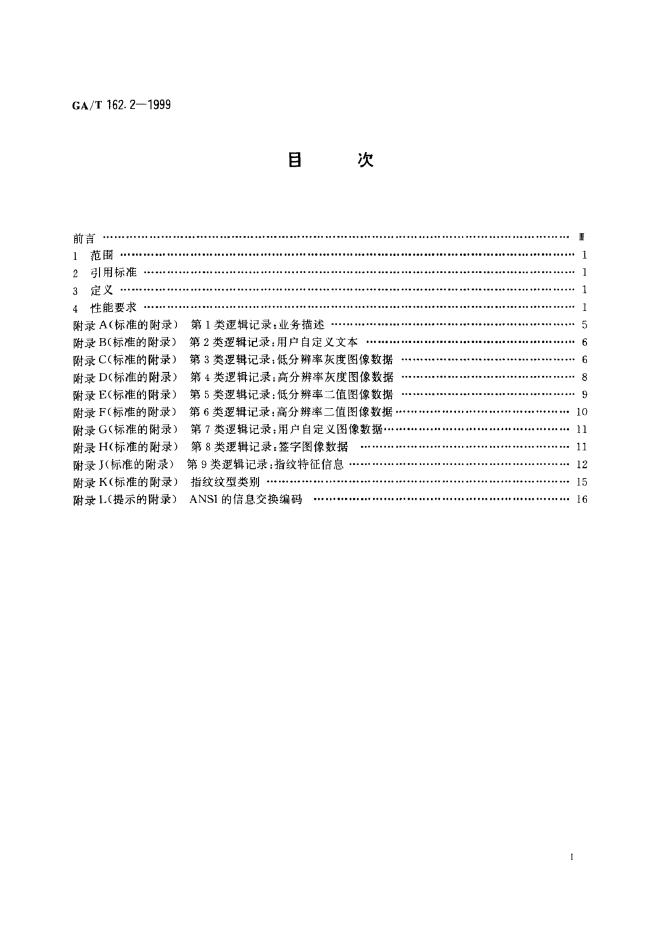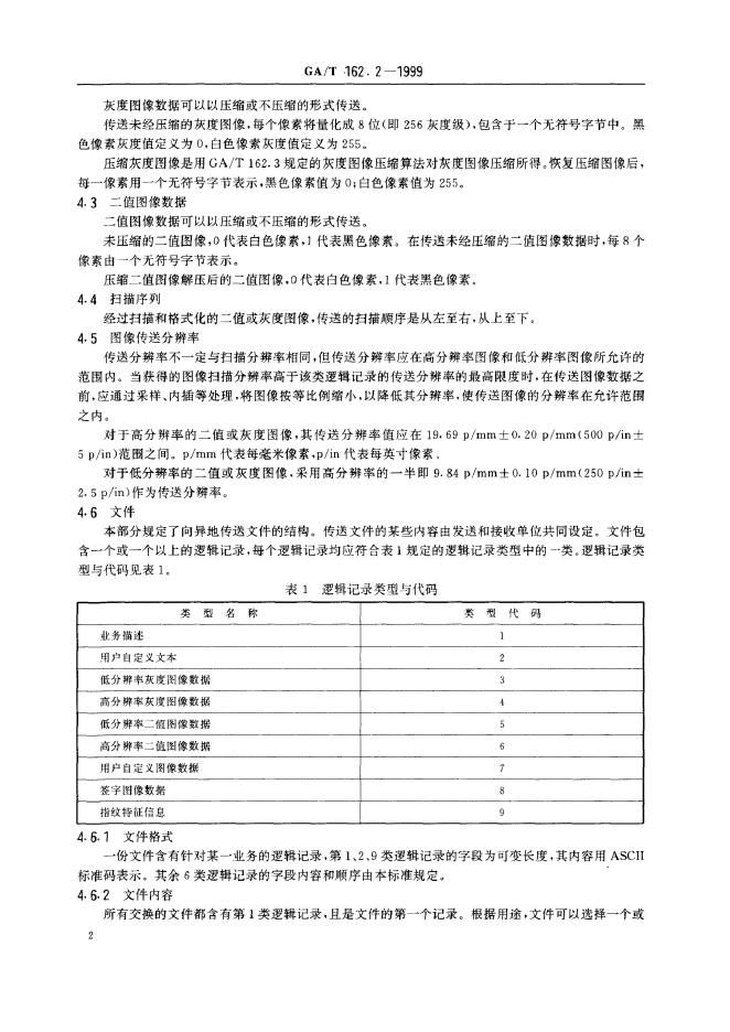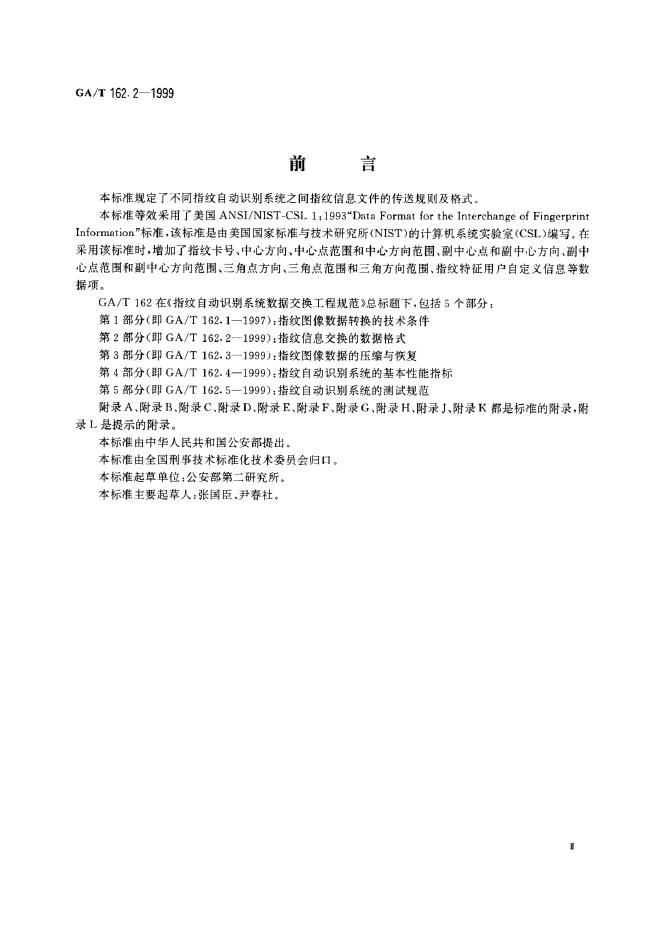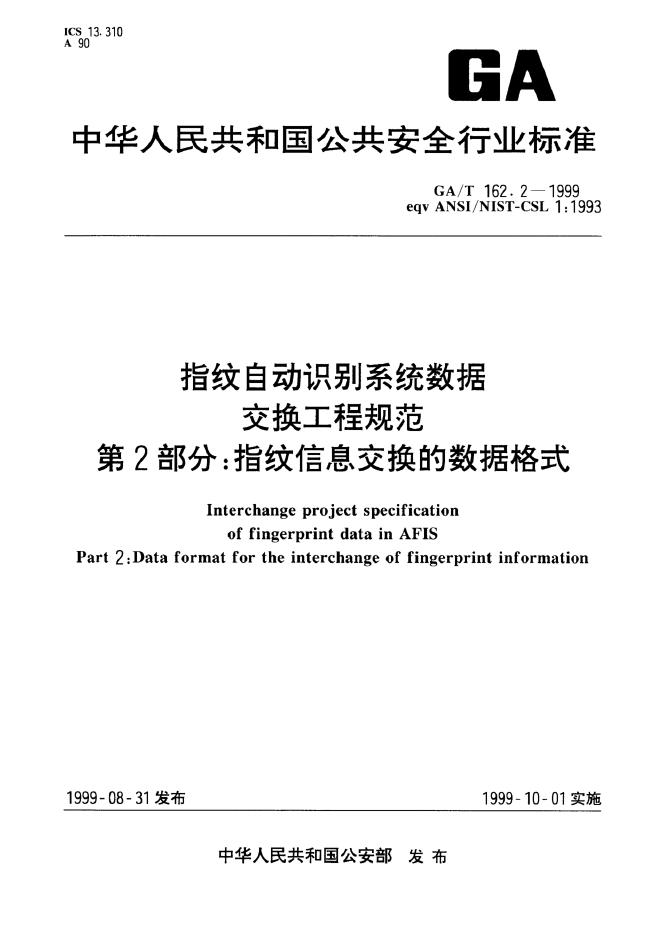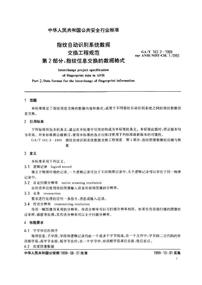 GA/T 162.2-1999 指纹自动识别系统数据交换工程规范 指纹信息交换的数据格式