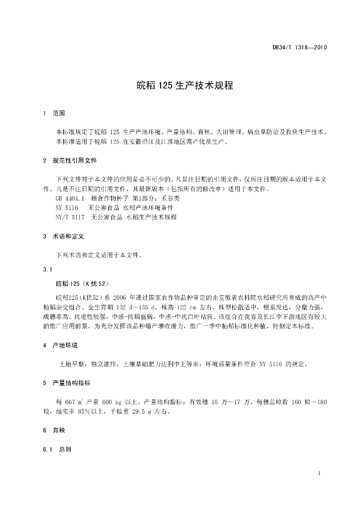 DB34/T 1318-2010 皖稻125 生产技术规程
