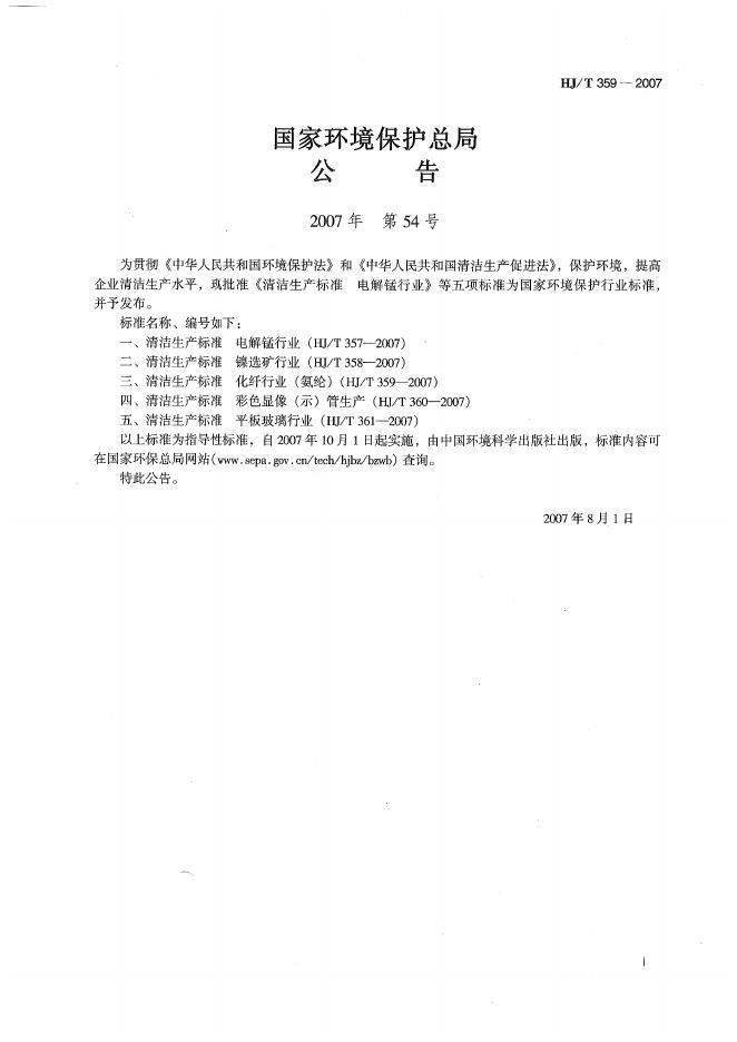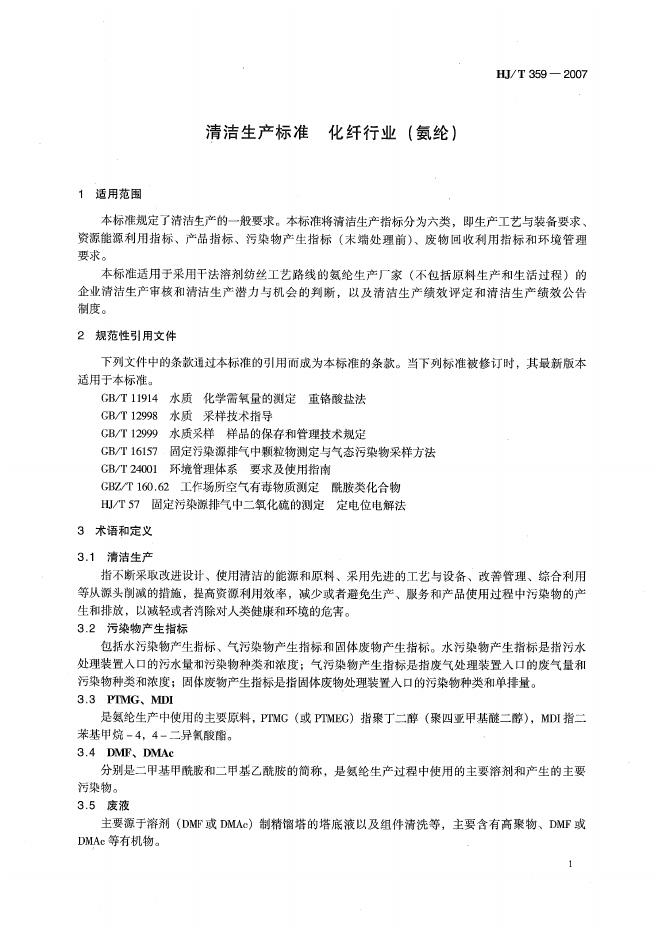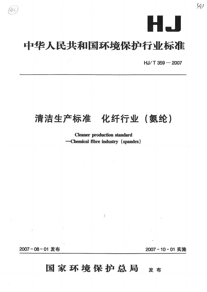 HJ/T 359-2007 清洁生产标准? 化纤行业(氨纶)