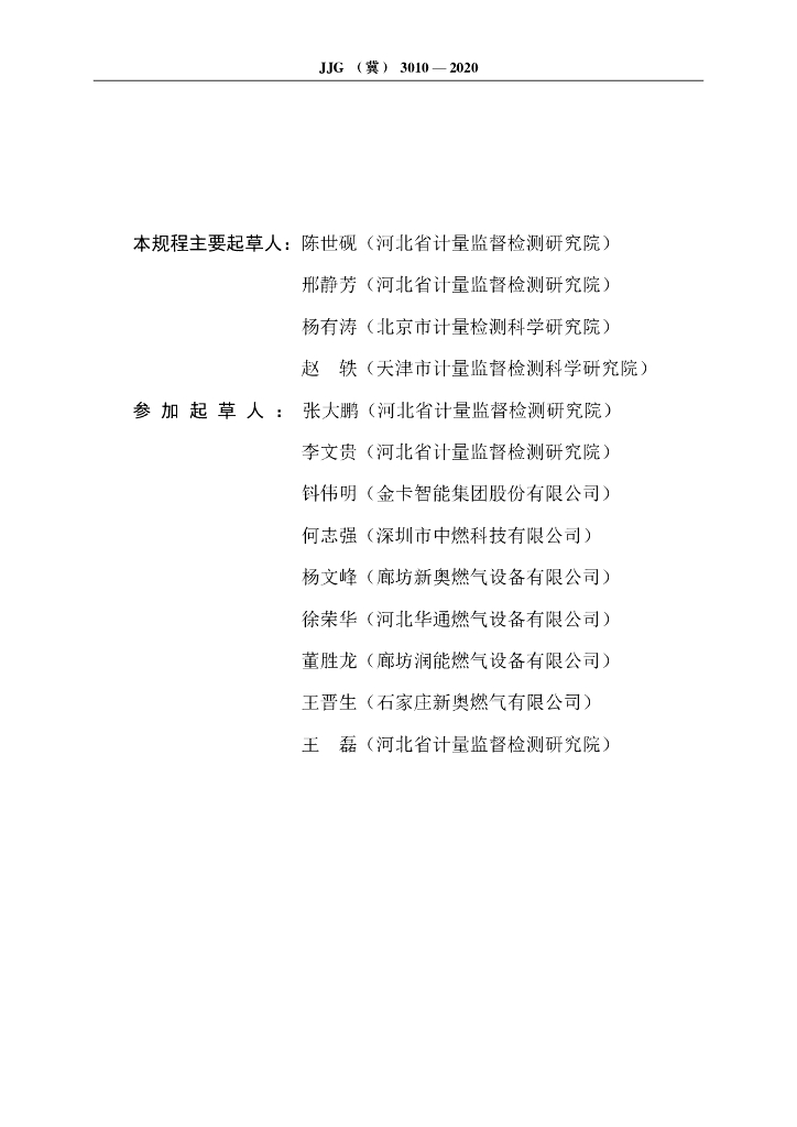 陈世砚(河北省计量监督检测研究院)、邢静芳(河北省计量监督检测研究院)、杨有涛(北京市计量检测科学研究院)、赵轶(天津市计量监督检测科学研究院)、张大鹏(河北省计量监督检测研究院)、李文贵(河北省计量监督检测研究院)、钭伟明(金卡智能集团股份有限公司)、何志强(深圳市中燃科技有限公司)、杨文峰(廊坊新奥燃气设备有限公司)、徐荣华(河北华通燃气设备有限公司)、董胜龙(廊坊润能燃气设备有限公司)、王晋生(石家庄新奥燃气有限公司)、王磊(河北省计量监督检测研究院)