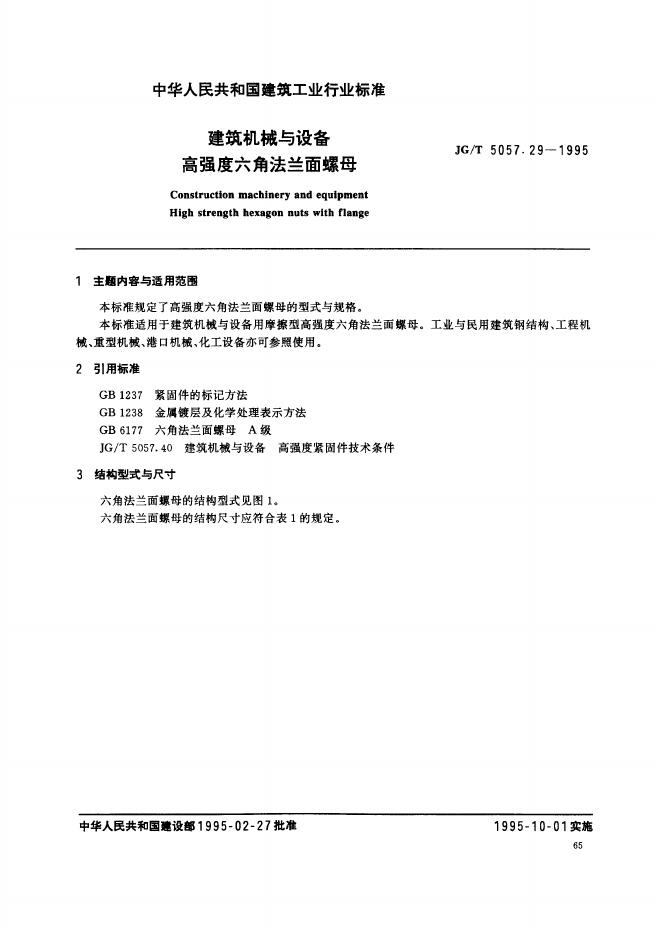 JG/T 5057.29-1995 建筑机械与设备 高强度六角法兰面螺母