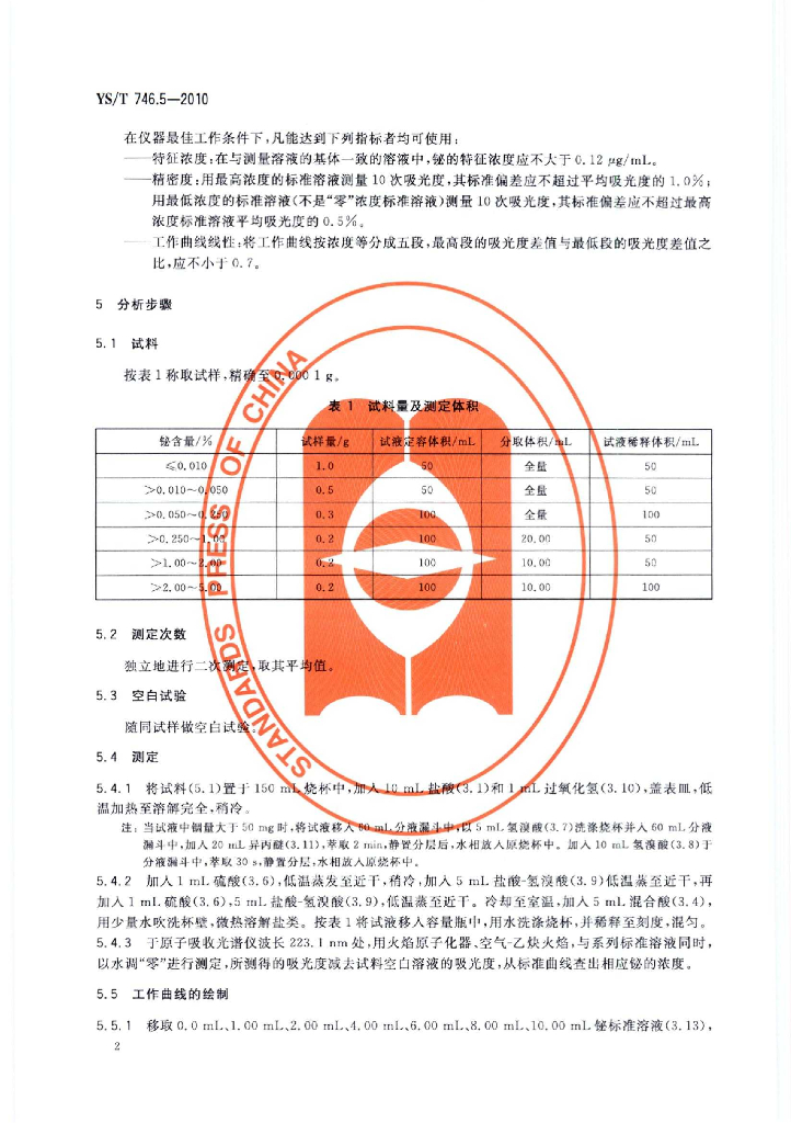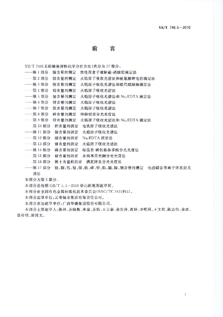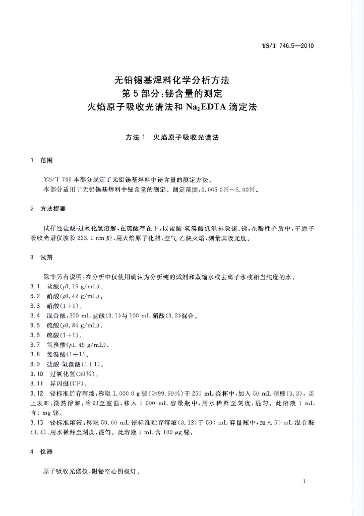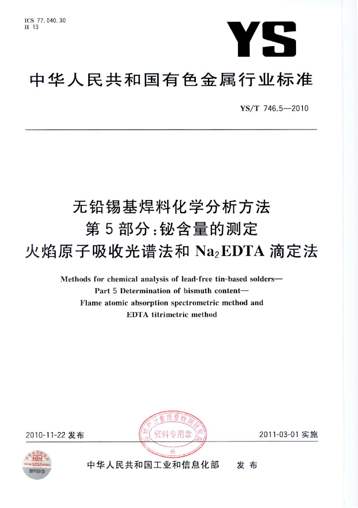 YS/T 746.5-2010 无铅锡基焊料化学分析方法 第5部分:铋含量的测定 火焰原子吸收和Na2EDTA滴定法