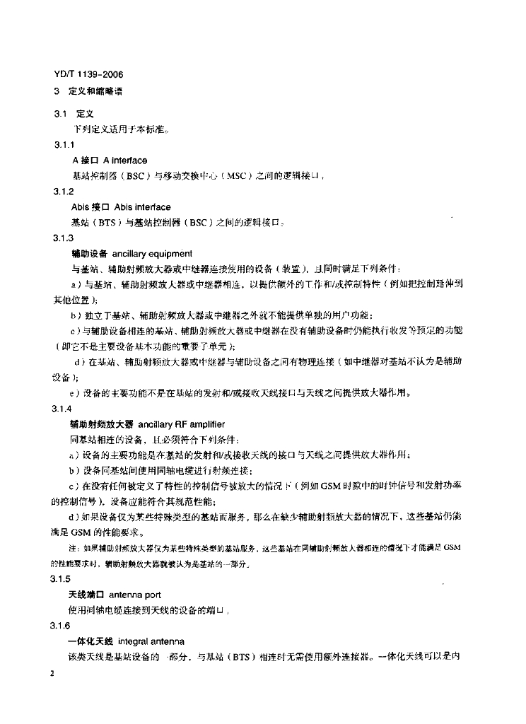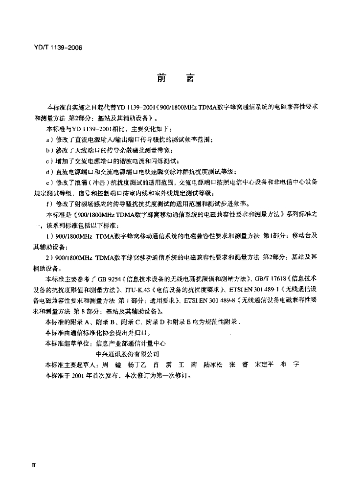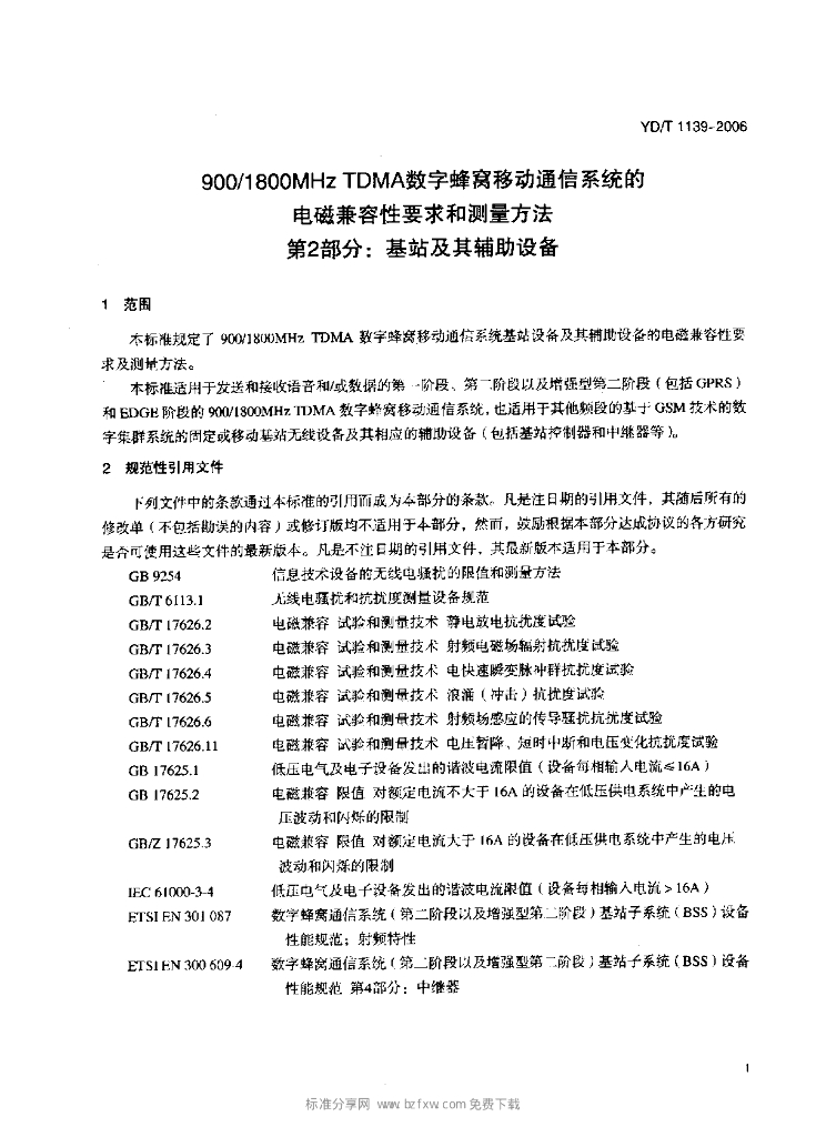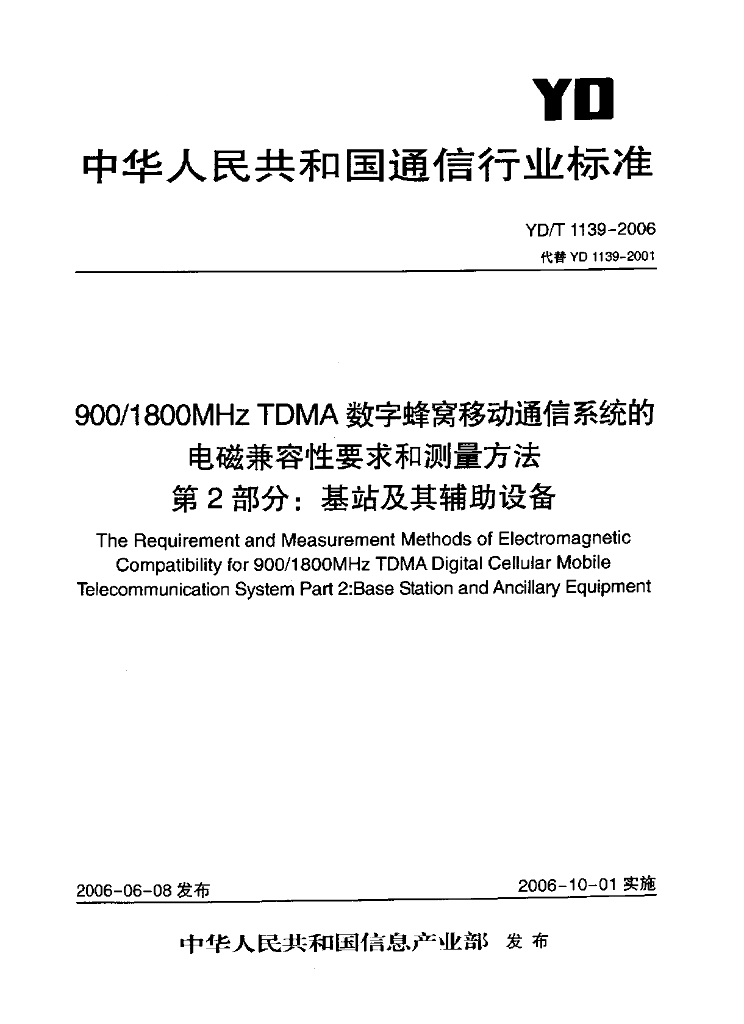 YD/T 1139-2006 900/1800MHz TDMA 数字蜂窝移动通信系统的电磁兼容性要求和测量方法 第2部分:基站及其辅助设备