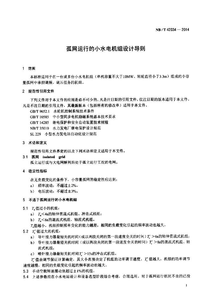 NB/T 42034-2014 孤网运行的小水电机组设计导则