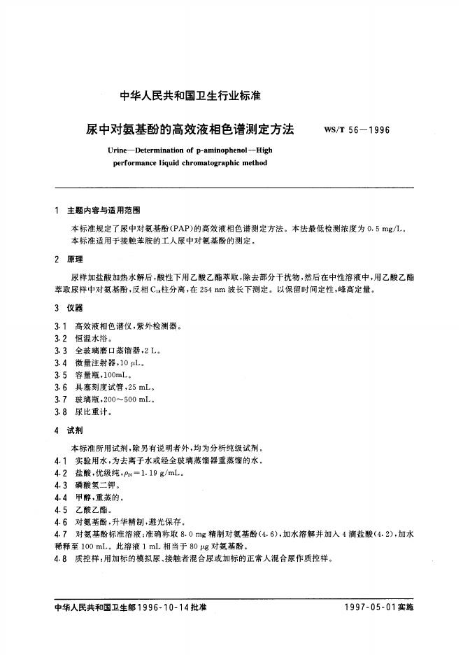 WS/T 56-1996 尿中对氨基酚的高效液相色谱测定方法